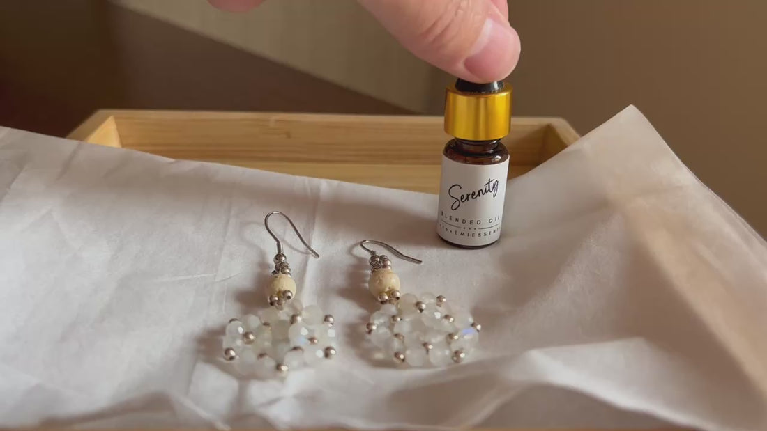 ピアスの溶岩部分(花輪上の一粒)にエッセンシャルオイルを1、2滴垂らし、香りをお楽しみください。ご入浴など、水に濡れる場合は外してください。